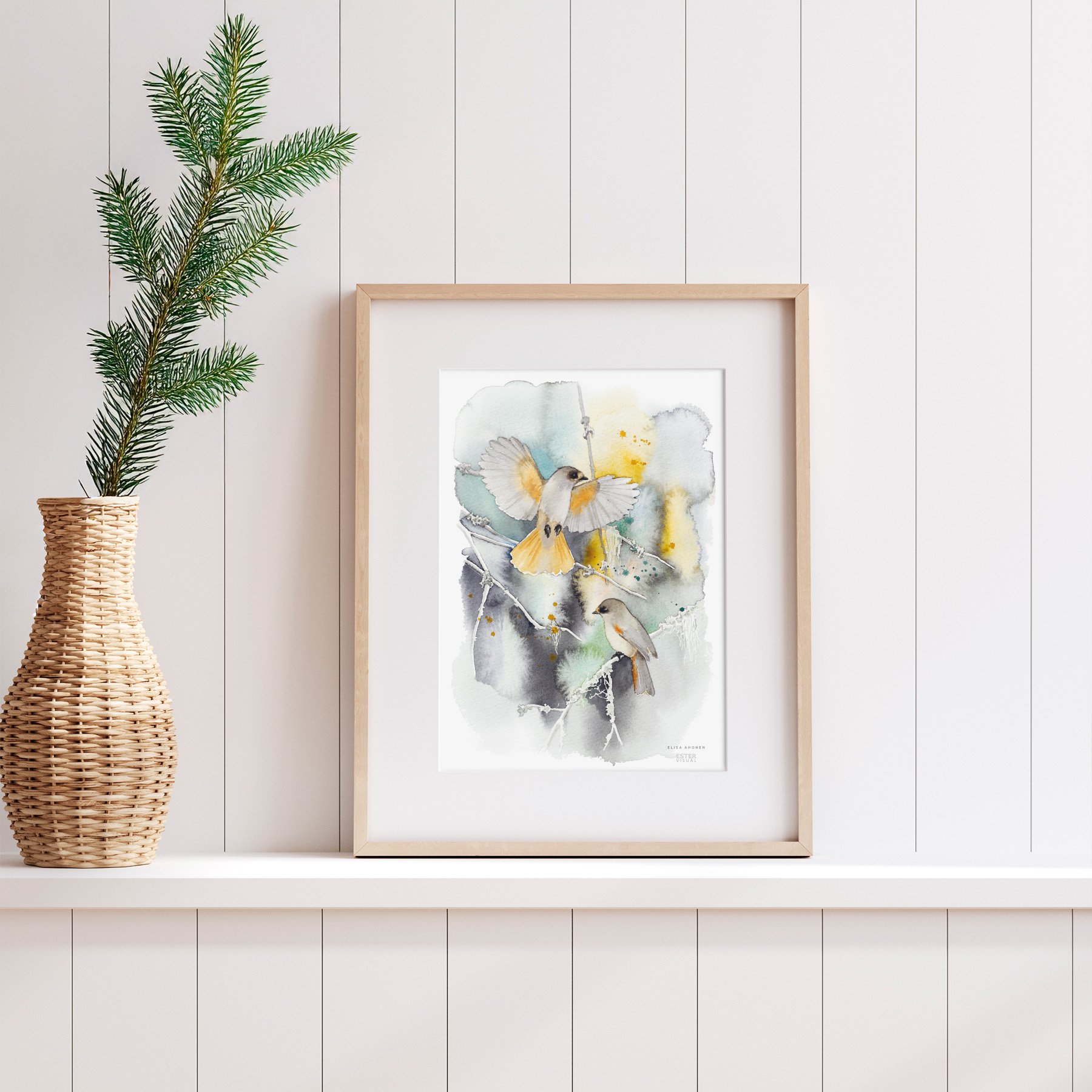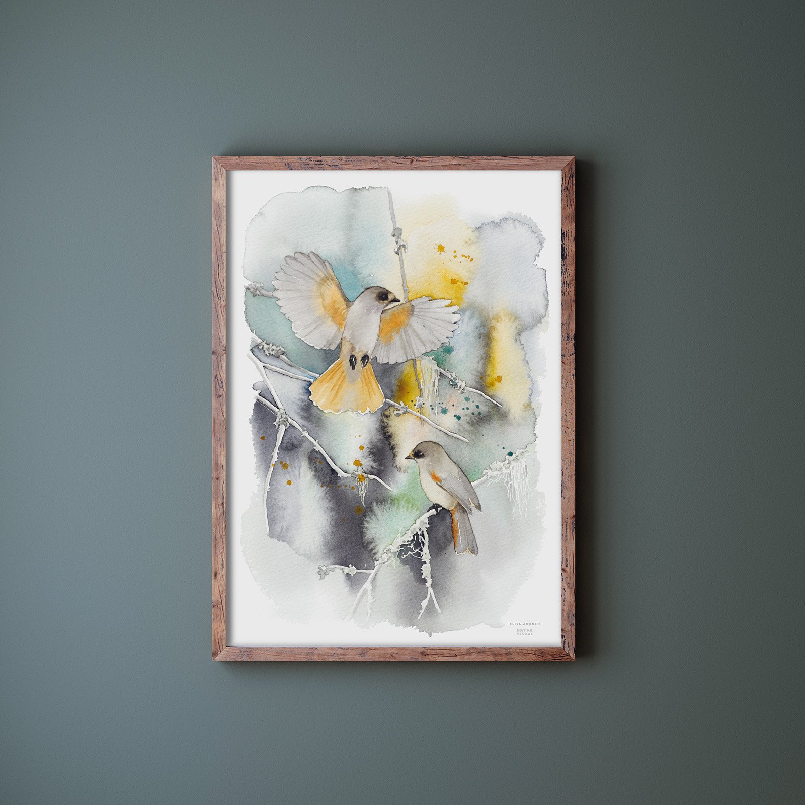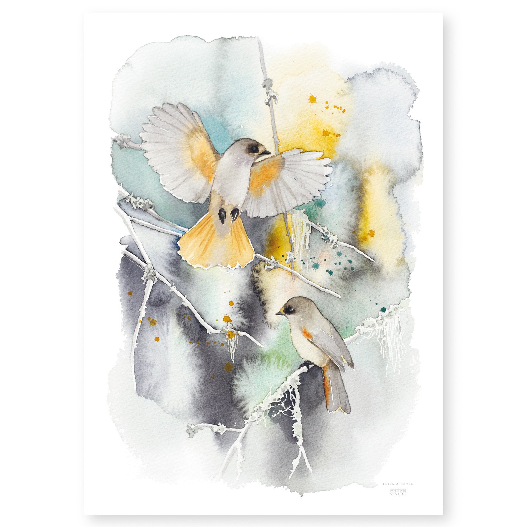Kuukkelit lennähtelevät vanhan naavametsän oksistossa. Tämä on metsää rakastavan juliste, joka henkii ikiaikaisen metsän aitoa tunnelmaa. Maalaus kuuluu Elisa Ahosen luonteikkaiden eläinkuvien sarjaan. Korkealaatuinen painojälki tuo esiin vesivärimaalauksen vivahteet myös suurimmissa julisteissa.