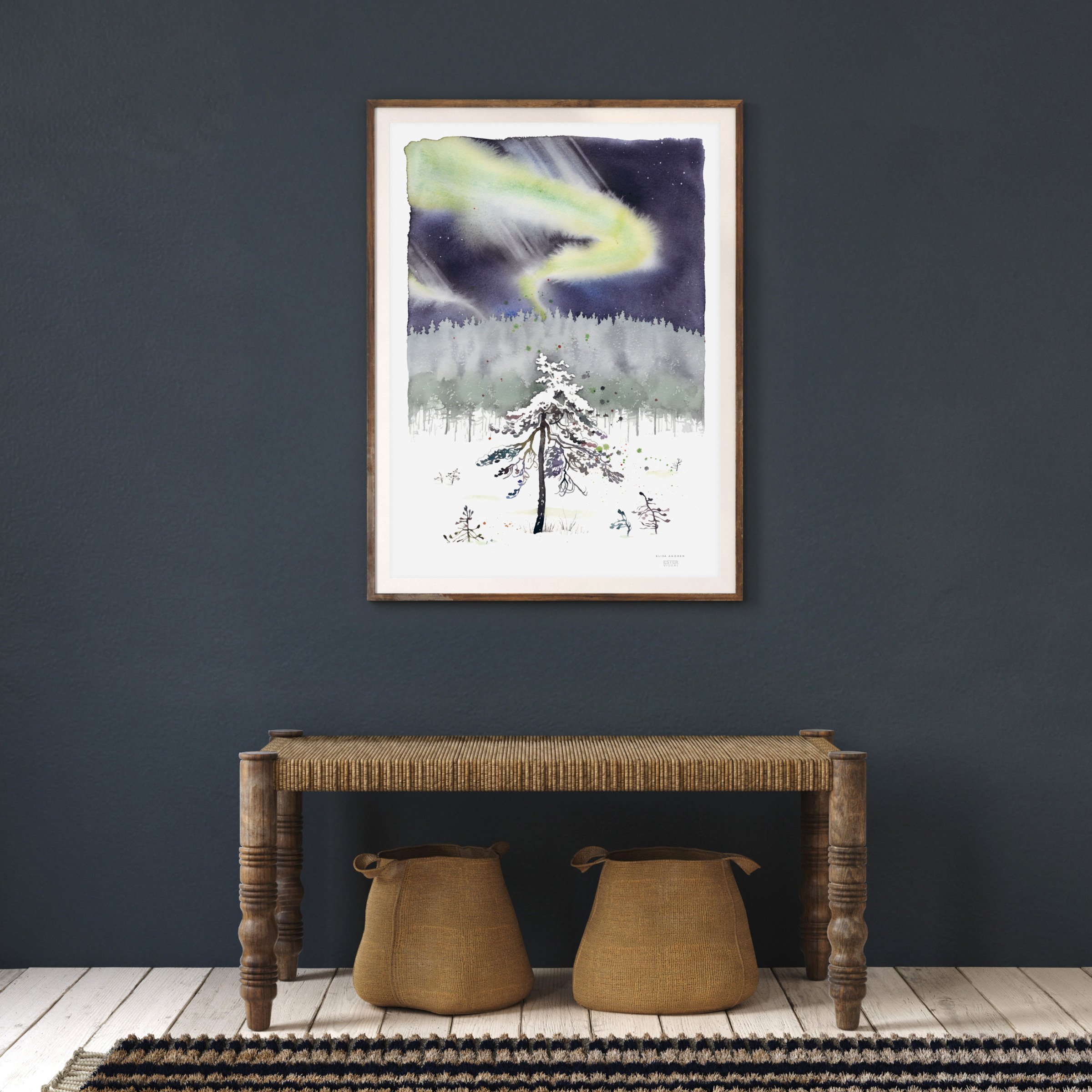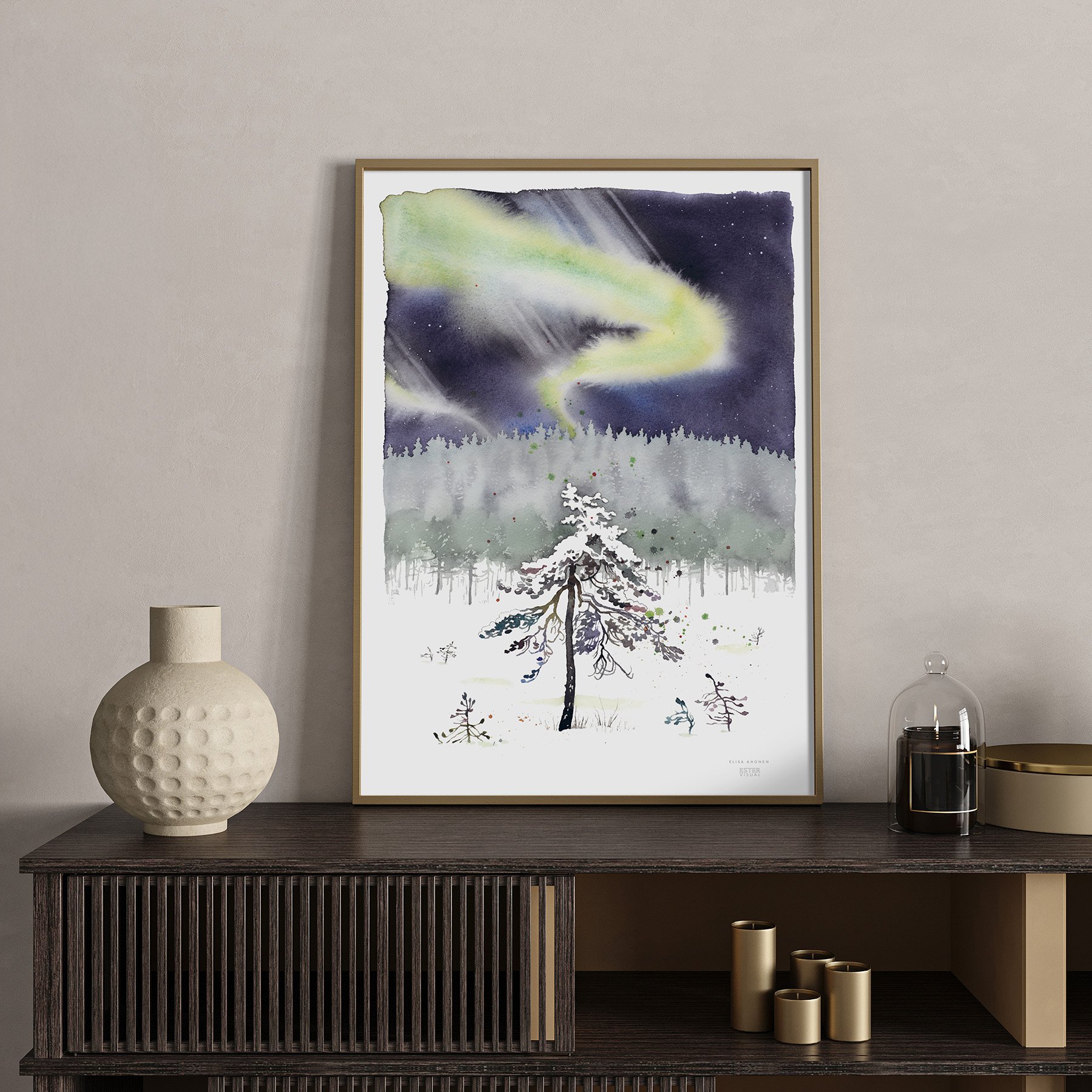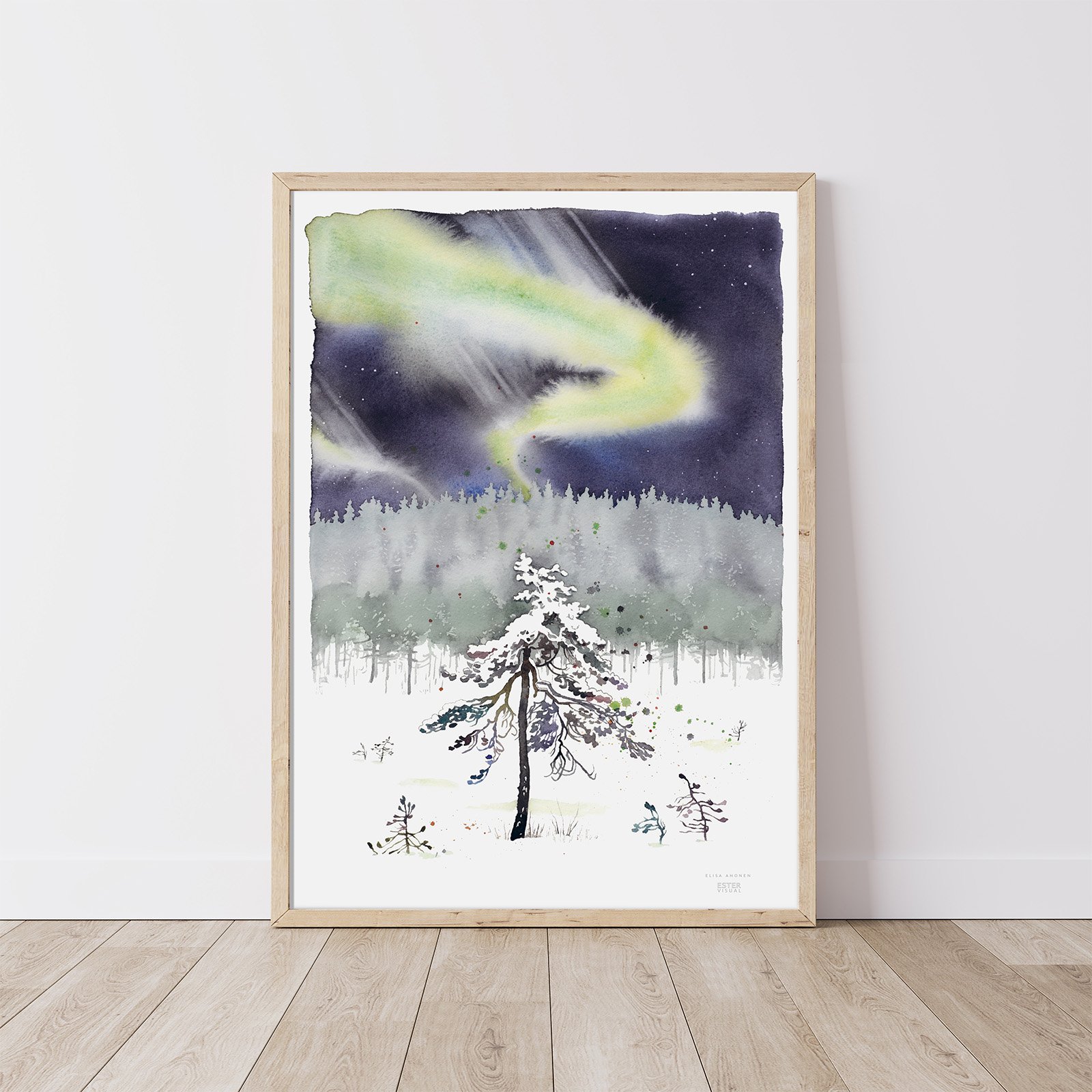 Suomänty kylpee taivaan valossa. Huurteiset puut suon laidalla todistavat, että revontulten alla pimeys ei olekaan mustaa. Tämä taidejuliste tuo kotiisi ripauksen pohjoista taikaa. Maalaus kuuluu Elisa Ahosen pohjoisten maisemakuvien sarjaan. Korkealaatuinen painojälki tuo esiin vesivärimaalauksen vivahteet myös suurimmissa julisteissa.