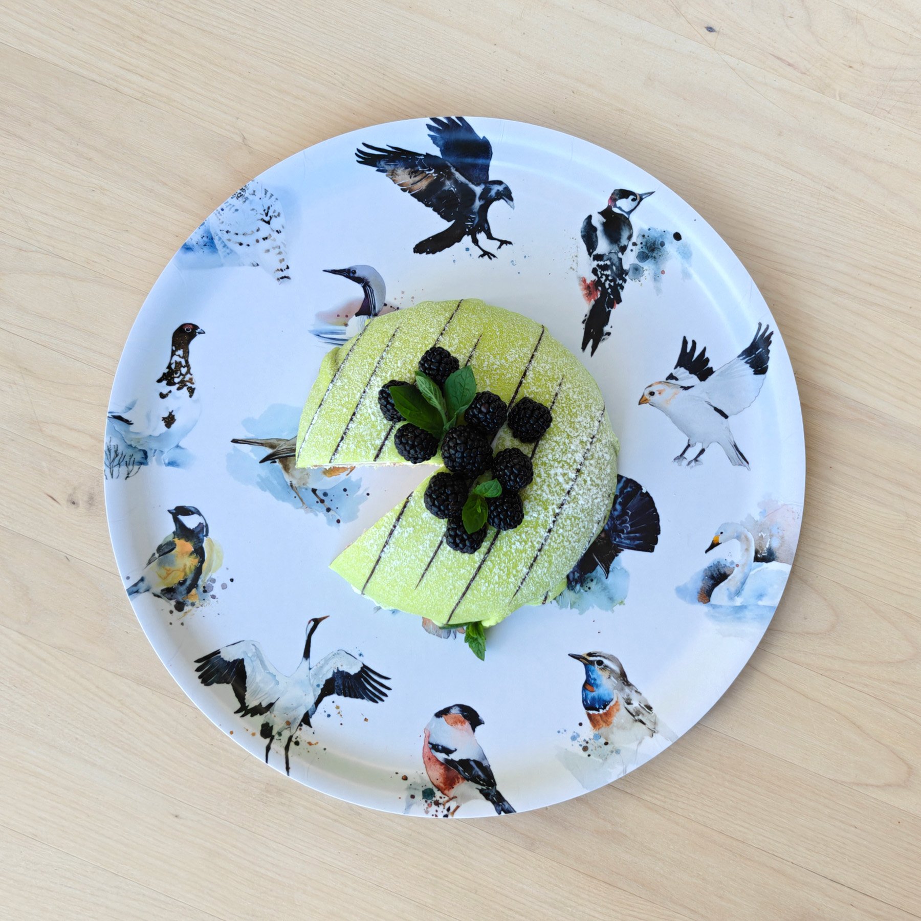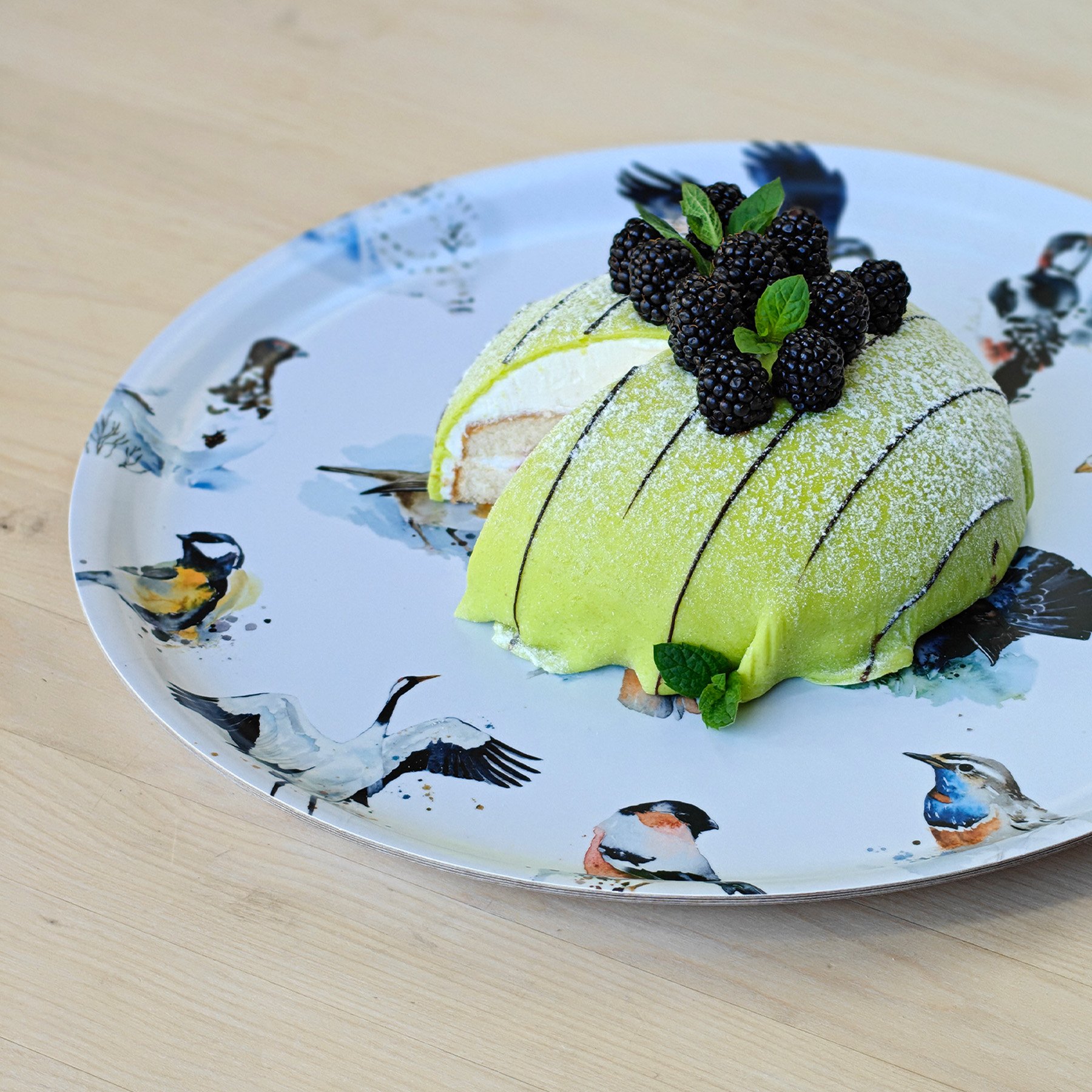 Ihana tarjotin lintuja rakastaville! Tarjotin on monipuolinen keittiön, kattauksen ja muun sisustuksen käyttöesine. Pyöreä tarjotin on pikkusyötävien lisäksi juuri sopiva kakkujen tarjoilulautaseksi. Voit myös sisustaa tekemällä tarjottimelle vuodenaikaan sopivan asetelman olohuoneen pöydälle.