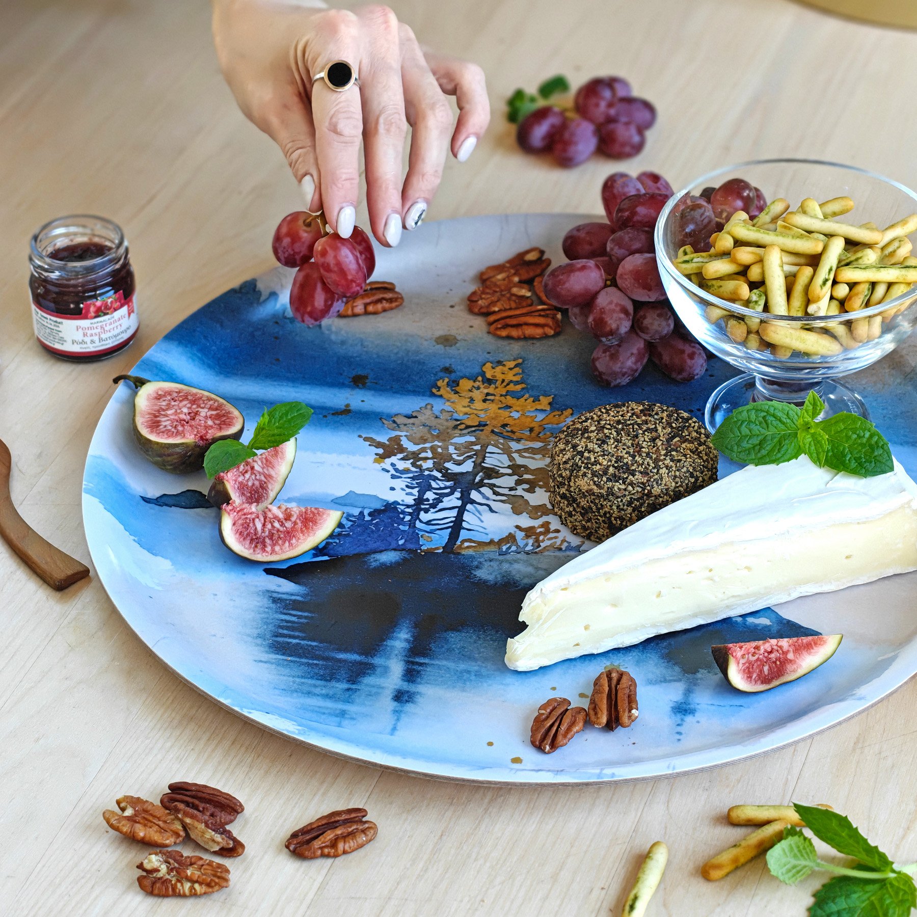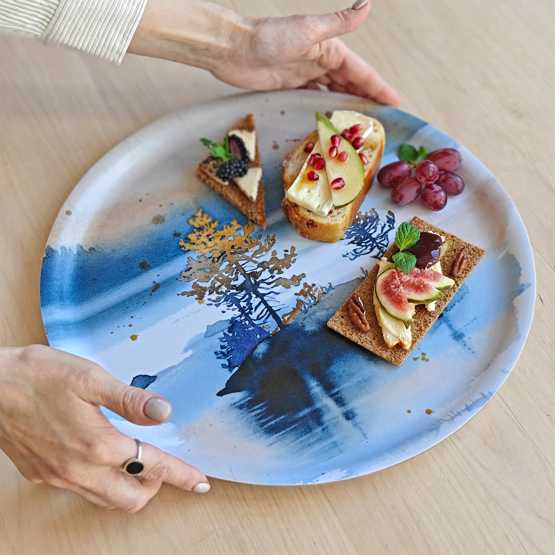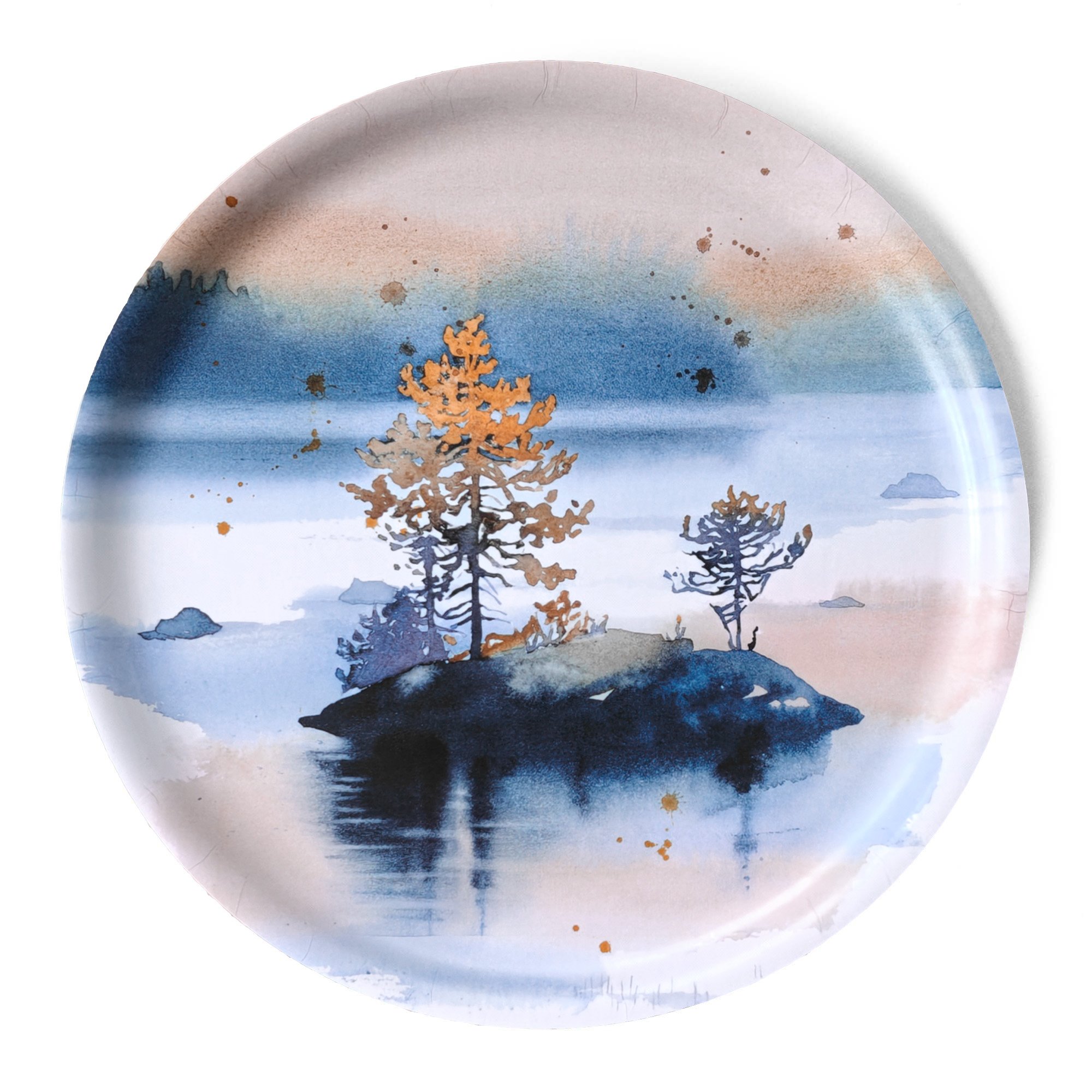 Utuisen kaunis Veden äärellä-tarjotin on monipuolinen keittiön, kattauksen ja muun sisustuksen käyttöesine. Pyöreä tarjotin on pikkusyötävien lisäksi juuri sopiva kakkujen tarjoilulautaseksi. Nosta maisematarjotin käytön päätteeksi keittiön katseenvangitsijaksi seinää vasten.